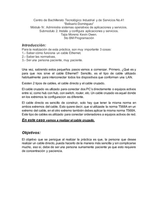 El documento describe cómo construir un cable Ethernet cruzado paso a paso. Explica que un cable Ethernet se usa para conectar dispositivos de red y que hay dos tipos: directo y cruzado. Luego detalla cada paso de la construcción, como pelar los cables, colocarlos según la normativa elegida, recortarlos y presionar los conectores para asegurar la conexión. El objetivo es enseñar a las personas a construir este tipo de cables de manera sencilla requiriendo paciencia y concentración.