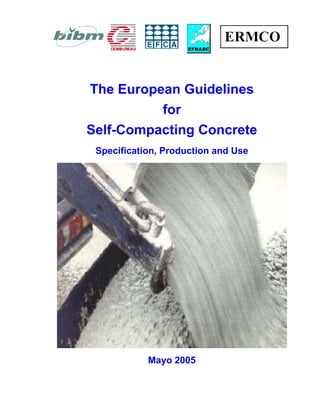 Este documento presenta las Directrices Europeas para el Hormigón Autocompactante. Define el HAC y proporciona información sobre sus propiedades, componentes, diseño de mezclas, producción, aplicación y especificaciones. El objetivo es promover una mayor aceptación y uso del HAC al cubrir aspectos no tratados en las normativas europeas. Las directrices están dirigidas a especificadores, diseñadores, productores y usuarios para ayudar en el desarrollo y empleo del HAC.