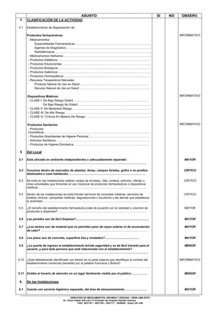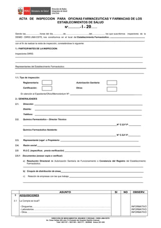 El documento presenta un acta de inspección realizada a un establecimiento farmacéutico. La inspección evaluó diversos aspectos como las instalaciones, organización interna, personal, seguridad y limpieza. Se verificó el cumplimiento de normas y buenas prácticas. En general, se constató que el establecimiento cuenta con las autorizaciones requeridas y cumplen la mayoría de los aspectos evaluados de manera adecuada.