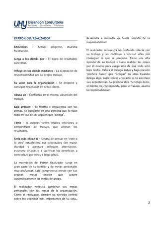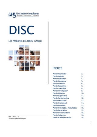 El documento describe 18 patrones de perfil clásico, incluyendo el Patrón Realizador, el Patrón Agente, el Patrón Evaluador, el Patrón Consejero y el Patrón Creativo. Para cada patrón, se describen sus emociones, metas, cómo juzgan a los demás, cómo influyen en los demás, su valor para la organización y cómo podrían ser más efectivos. El documento analiza las fortalezas y debilidades de cada patrón.