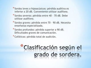 El documento clasifica diferentes tipos de pérdida auditiva, desde sordos leves hasta cofóticos, y describe sus capacidades lingüísticas y necesidades educativas. Los niños sordos pueden adquirir el lenguaje a través de la visión y utilizan diversos códigos para comunicarse. También se ofrecen recomendaciones sobre la organización del aula y consideraciones instruccionales para facilitar el aprendizaje de estos alumnos.