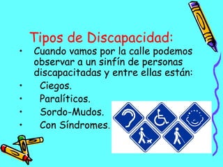 El documento describe diferentes tipos de discapacidad, incluyendo a los ciegos, paralíticos y sordo-mudos. Explica que la ceguera puede ser causada por condiciones como la catarata, glaucoma o degeneración macular. Además, señala que los niños ciegos pueden aprender como los demás a través de métodos especializados y que el sistema Braille es un método táctil de lectura y escritura creado para personas ciegas.