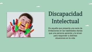 La discapacidad intelectual se caracteriza por limitaciones significativas en el funcionamiento intelectual y las habilidades adaptativas que se manifiestan antes de los 18 años. Puede ser causada por factores genéticos, problemas durante el embarazo o el parto, o después del nacimiento. Existen diferentes niveles de gravedad dependiendo del cociente intelectual, y las personas con discapacidad intelectual pueden presentar retrasos en el lenguaje, problemas de comportamiento, y necesitar apoyo de por vida.