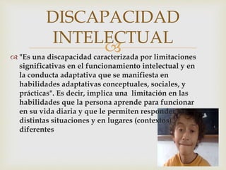 Este documento trata sobre la discapacidad intelectual leve. Explica que implica limitaciones en habilidades adaptativas conceptuales, sociales y prácticas que afectan el funcionamiento diario de una persona. Define la discapacidad intelectual leve como aquella con un coeficiente intelectual entre 50-69, requiriendo apoyo en áreas como autonomía, cognición, lenguaje y conducta. Finalmente, presenta un plan de actividades semanales para un grupo de personas con esta discapacidad enfocadas en el desarrollo de habilidades cognit