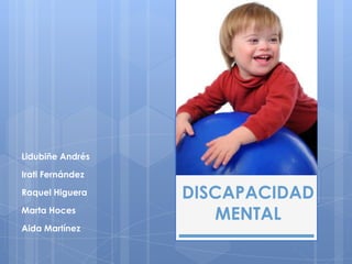 El documento describe la discapacidad mental, sus características, causas, tipos y diagnóstico. Define la discapacidad mental como un desarrollo mental incompleto o detenido que afecta la inteligencia de forma global. Explica las características de los niños con discapacidad mental como limitaciones en el lenguaje, atención e impulsividad. Además, clasifica la discapacidad mental según el CI e identifica síndromes asociados como el síndrome de Down.