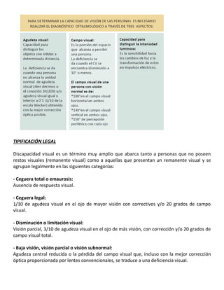 Este documento describe la discapacidad visual, incluyendo las definiciones de deficiencia visual, ceguera y baja visión, así como las causas y clasificaciones. Explica que las personas con discapacidad visual tienen necesidades educativas específicas como aprender habilidades para la vida diaria, orientación, lectura en braille, y desarrollar otros sentidos. El documento también cubre la evaluación funcional de la visión y las áreas clave de atención como la comunicación.