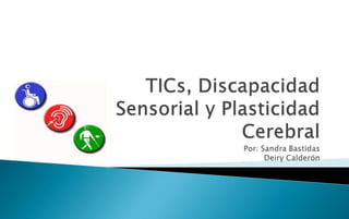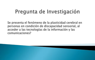 El documento describe cómo las personas con discapacidad sensorial pueden desarrollar plasticidad cerebral al acceder a las tecnologías de la información y la comunicación. Explica que el cerebro se adapta a nuevas condiciones contextuales a través del aprendizaje y entrenamiento. También detalla algunas tecnologías como el sistema Braille, JAWS y las aulas de tecnología "Conectando Sentidos" que ayudan a las personas con discapacidad sensorial a acceder a la información y comunicarse.