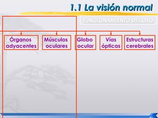 El documento describe el funcionamiento normal de la visión y los principales trastornos visuales. Explica las estructuras oculares implicadas en la visión como los órganos adyacentes, los músculos oculares, el globo ocular, las vías ópticas y las estructuras cerebrales. También describe los diferentes tipos de trastornos funcionales y alteraciones ópticas como las relacionadas con la córnea, úvea, cristalino, retina, interior del ojo, nervio óptico y movilidad ocular. Finalmente, clas