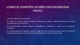 Los niños con discapacidad visual pueden presentar dificultades en el lenguaje, la psicomotricidad y el desarrollo cognitivo, y requieren estímulos auditivos, del gusto y el olfato, visuales y psicomotores. Para apoyar su aprendizaje, necesitan adaptaciones como estimulación específica, más tiempo para tareas, programas de autonomía, códigos de lectura adecuados, apoyo escolar y adecuación del entorno.