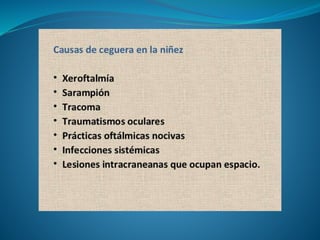 El documento habla sobre la discapacidad visual. Define ceguera y baja visión, e indica que aproximadamente el 80% de las 10 millones de personas con discapacidad visual en Latinoamérica tienen baja visión, mientras que el 10% son ciegos. Describe algunas causas comunes como cataratas, glaucoma y retinosis, así como síntomas. Explica consideraciones en la educación de personas con discapacidad visual.