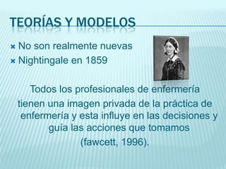 Este documento describe los fundamentos teóricos de la disciplina de enfermería. Explica que los modelos conceptuales y teorías de enfermería no son nuevos, sino que se remontan a Nightingale en 1859. Define conceptos clave como metaparadigma, filosofía, modelos conceptuales, teoría e indicadores empíricos. Además, describe las características de los modelos conceptuales, teorías y cómo estas se clasifican y han evolucionado para guiar la práctica, educación e investigación en enfermería.