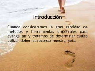 El documento describe el proceso de discipulado como una segunda etapa en la "carrera de relevo" del evangelismo. Explica que el objetivo no es solo compartir el Evangelio, sino hacer discípulos que crezcan en su relación con Dios y con la iglesia. Detalla los componentes del discipulado como ser, saber y hacer, y ofrece principios y pautas prácticas para formar discípulos siguiendo el modelo de Jesús.