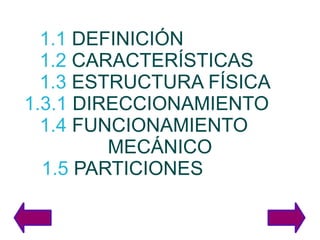 El documento describe las características y funcionamiento de un disco duro. Un disco duro contiene uno o más platos rígidos que giran a alta velocidad, cada uno con cabezales de lectura/escritura en ambas caras. Los datos se almacenan magnéticamente en pistas y sectores concéntricos. El disco duro permite el acceso aleatorio a los datos mediante la posicionamiento preciso de los cabezales utilizando motores electrónicos y la rotación de los platos.