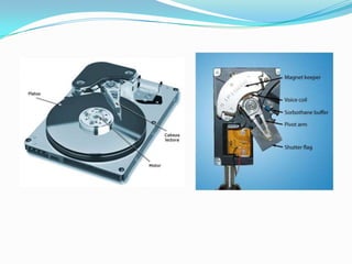 El documento describe las características y componentes de los discos duros. Explica que los discos duros almacenan datos magnéticamente en discos giratorios y que su capacidad de almacenamiento se mide en gigabytes. También describe las partes principales de un disco duro como los platos, cabezales y pistas, y los diferentes tipos de conexión e interfaz como IDE, SATA y SAS. Finalmente, contrasta las tecnologías de HDD y SSD.
