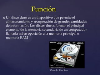 Un disco duro es un dispositivo de almacenamiento que permite guardar grandes cantidades de información como parte de la memoria secundaria de una computadora. Los discos duros contienen platos giratorios con superficies magnéticas y una aguja de lectura/escritura que puede acceder a la información almacenada. Los nuevos discos duros y discos de estado sólido ofrecen mayores capacidades de almacenamiento, velocidades más rápidas y menores tiempos de acceso a la información.