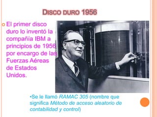 El primer disco duro fue inventado por IBM en 1956 y se llamó RAMAC 305. Consistía en 50 discos de aluminio que giraban rápidamente y podía almacenar hasta 5 megabytes de datos. A lo largo de las décadas siguientes, los discos duros aumentaron en capacidad, velocidad y disminuyeron en tamaño, con hitos como la introducción del formato de 3.5 pulgadas por Sony en 1982. Actualmente existen varios tipos de conexión como IDE, SATA, SCSI y SAS.