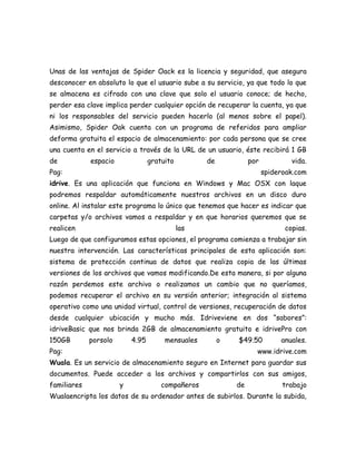 Estos documentos describen varios servicios de almacenamiento en la nube que permiten a los usuarios almacenar archivos digitales de forma remota y acceder a ellos desde cualquier dispositivo a través de Internet. Algunos servicios como OpenDrive, SpiderOak y IDrive ofrecen espacio de almacenamiento gratuito limitado, mientras que otros como Box.net y SugarSync cobran una tarifa mensual por más espacio de almacenamiento. La mayoría de estos servicios también permiten compartir archivos de forma segura.