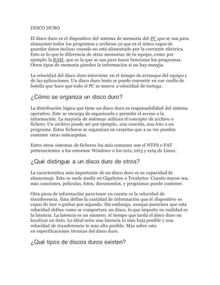 El disco duro es el dispositivo de almacenamiento principal del PC que mantiene los datos incluso cuando está apagado, a diferencia de la RAM. Los discos duros se organizan en archivos y carpetas gestionadas por el sistema operativo y varían en capacidad, velocidad y tipo (magnético o de estado sólido). El tipo de disco duro apropiado depende del uso y presupuesto, aunque los SSD son mejores para usuarios profesionales que manejan grandes cantidades de datos como video.