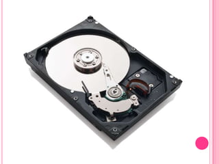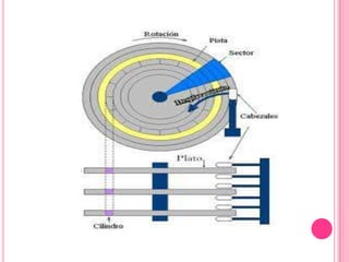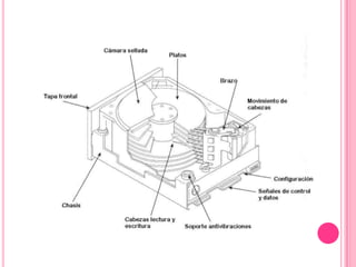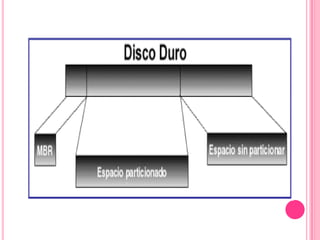 La estructura lógica de un disco duro incluye un sector de arranque, espacio particionado y espacio sin particionar. Internamente, los discos duros se dividen en volúmenes que contienen un sector de arranque, tabla de asignación de archivos, copias de la tabla, directorio raíz y zona de datos. Las características de rendimiento incluyen capacidad de almacenamiento, velocidad de rotación, tiempo de acceso y tasa de transferencia. Las particiones dividen lógicamente el disco en unidades donde