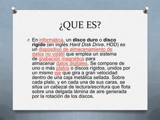 El documento describe los componentes y especificaciones de los discos duros. Un disco duro almacena datos mediante cabezas de lectura/escritura que leen y escriben en platos magnéticos giratorios. Los componentes incluyen los platos, cabezas, eje central y electrónica. Las especificaciones incluyen la capacidad, velocidad de rotación, tiempo de acceso y memoria cache. También se explica cómo instalar un disco duro IDE conectándolo a la placa base y configurando los jumpers.