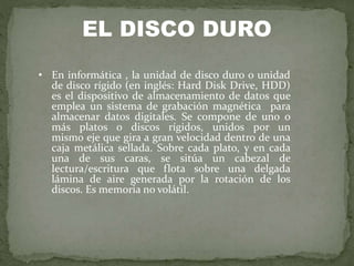 El documento describe las partes principales de un disco duro, incluyendo los discos, cabezas de lectura/escritura, brazo y eje. Los discos están recubiertos con una capa magnética y giran a alta velocidad para permitir que las cabezas lean y escriban datos. El brazo mueve las cabezas por encima de los discos para acceder a diferentes sectores, y el eje central mantiene los discos en su lugar mientras giran.