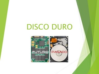 El documento describe las características y tipos de discos duros. Un disco duro almacena de forma permanente los programas y archivos del PC usando campos magnéticos en discos giratorios. Existen discos duros magnéticos tradicionales y discos duros de estado sólido (SSD), los cuales almacenan la información en matrices de transistores en lugar de discos, proporcionando mayor velocidad y durabilidad. El documento compara las ventajas y desventajas de los SSD frente a los discos duros magn