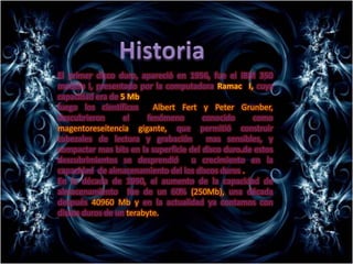 El primer disco duro apareció en 1956 con una capacidad de 5 Mb. Descubrimientos posteriores permitieron aumentar la capacidad de almacenamiento, llegando a 1 terabyte en la actualidad. Los discos duros almacenan grandes cantidades de datos y programas de forma permanente mediante platos giratorios y cabezales de lectura/escritura. Poseen componentes mecánicos y electrónicos que les permiten direccionar y transferir la información de forma eficiente.