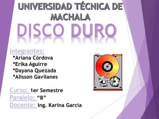 El documento describe los componentes internos y características de un disco duro. Internamente, un disco duro contiene platos con pistas y sectores donde se almacenan los datos. Los discos duros varían en capacidad de almacenamiento, RPM, y velocidad de transferencia de datos. Existen diferentes tipos de conexiones para discos duros internos y externos.