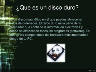 El disco duro es un disco magnético donde se almacenan los datos y programas de una computadora. El primer disco duro fue inventado por IBM en 1956 y podía almacenar 5 megabytes, mientras que los discos duros modernos pueden almacenar terabytes de datos. Los discos duros han evolucionado de ser unidades grandes y pesadas a discos más pequeños como los discos duros de estado sólido, y su capacidad de almacenamiento ha aumentado dramáticamente a lo largo de los años.