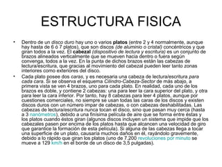 El documento describe la estructura y funcionamiento de los discos duros. Un disco duro contiene uno o más platos giratorios sobre los que se sitúan cabezales de lectura/escritura. Los datos se almacenan en sectores concéntricos divididos en pistas. El primer disco duro pesaba una tonelada y tenía 5 MB de capacidad, mientras que ahora los discos duros tienen terabytes de capacidad y son más pequeños. Los discos duros usan magnetismo para almacenar datos de forma no volátil.