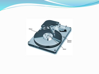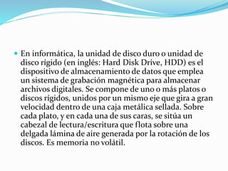 Este documento describe la unidad de disco duro, el cual almacena datos usando un sistema de grabación magnética en uno o más platos giratorios. Fue inventado por IBM en 1956 y desde entonces ha aumentado en capacidad mientras disminuye en precio, convirtiéndose en la principal opción de almacenamiento secundario. Los discos duros varían en tamaño desde los primeros modelos de IBM hasta los estándares actuales de 3.5 y 2.5 pulgadas, y se comunican con la computadora a través de controladores e interfaces como