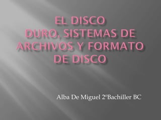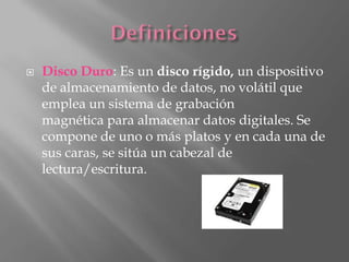 El documento describe los componentes principales de un disco duro, incluyendo discos o platos, cabezales de lectura/escritura, pistas, cilindros, sectores y clústeres. Explica los diferentes tipos de formateo, como el formateo a bajo nivel, que puede dañar el disco, y el formateo de alto nivel, que es más seguro. También describe los principales sistemas de archivos como FAT, FAT32 y NTFS y las diferencias entre discos duros convencionales y discos de estado sólido.