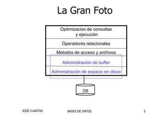 Este documento resume conceptos clave sobre bases de datos y almacenamiento de datos. Explica que los datos se almacenan en memoria principal para su uso constante y en disco para almacenamiento permanente. Describe el tiempo de acceso a disco, incluyendo búsqueda, retardo rotacional y transferencia. También cubre optimizaciones como doble buffering para mejorar el rendimiento de E/S.