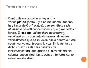 El documento describe la estructura física y lógica de un disco duro. Físicamente, un disco duro contiene uno o más platos giratorios y cabezales de lectura/escritura que se mueven hacia adentro y afuera. Lógicamente, la información se almacena en cilindros, pistas y sectores. El documento también explica los diferentes tipos de conexión, factores de forma y cómo el disco duro mantiene la integridad mediante el control de la presión del aire dentro del recinto.