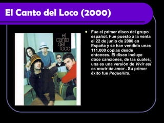 Este documento resume los álbumes de estudio del grupo español El Canto del Loco desde su primer disco en 2000 hasta su álbum de versiones en 2009. Describe cada álbum, incluyendo detalles como el número de canciones, fecha de lanzamiento y estilo musical. El documento proporciona una línea de tiempo de la discografía del grupo a lo largo de sus primeros 10 años de carrera.