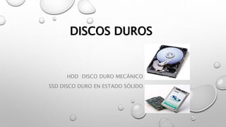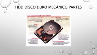 El documento describe las partes principales de los discos duros mecánicos (HDD) y de estado sólido (SSD). En los HDD, la información se almacena en clusters distribuidos en sectores a lo largo de pistas en los platos, los cuales son accedidos por las cabezas de lectura/escritura. En los SSD, la información se almacena en celdas de memoria, y pueden conectarse a través de interfaces PCIe o SATA, siendo PCIe más rápido.