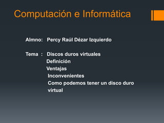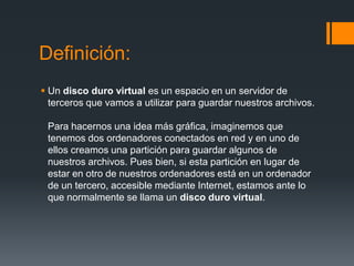 Un disco duro virtual es un espacio de almacenamiento en un servidor de terceros accesible a través de Internet. Tiene la ventaja de permitir el acceso a archivos desde cualquier lugar, pero también inconvenientes como límites de tráfico y tamaño de archivos, así como problemas de seguridad y continuidad del servicio para opciones gratuitas. Puede ser útil para compartir archivos pero no como copia de seguridad primaria.