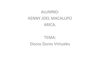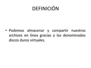 Este documento define los discos duros virtuales y describe varios servicios populares como Scribd, Dropbox y Google Docs. Scribd permite a los usuarios subir y compartir una variedad de formatos de archivo y clasificarlos con etiquetas. Dropbox permite almacenar, sincronizar y compartir archivos entre dispositivos de forma gratuita con 2GB de almacenamiento. Google Docs también permite crear y editar documentos en línea con 1GB de almacenamiento gratis.