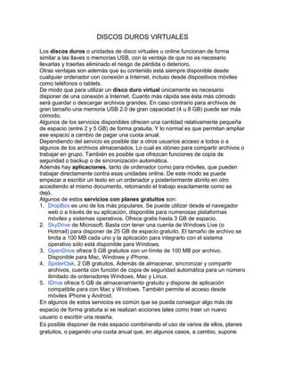Los discos duros virtuales permiten almacenar archivos en línea que pueden accederse desde cualquier dispositivo con conexión a Internet, evitando el riesgo de pérdida de archivos al no tener que llevar una unidad física. Varias opciones populares como Dropbox, Microsoft OneDrive y Google Drive ofrecen algunos gigabytes de almacenamiento gratuito, mientras que servicios como SpiderOak, IDrive y OpenDrive generalmente proporcionan hasta 5GB sin costo.