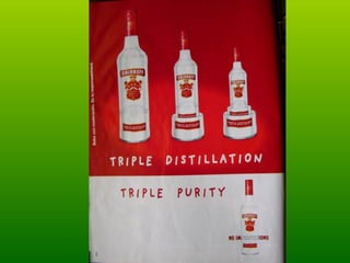 Este documento analiza la publicidad de alcohol y tabaco. Aborda conceptos como la impresión creada, los temas, los métodos de venta, la imagen, el texto, la descripción, la marca y el producto para evaluar críticamente los anuncios. También cubre la publicidad antialcohol y antitabaco.