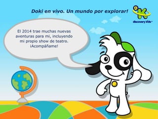 El documento anuncia el show de teatro "Doki en vivo. Un mundo por explorar!" que se presentará del 17 al 19 de octubre en el Coliseo Rubén Rodríguez en Bayamón. El show seguirá a Doki y Mundi en un viaje para convertirse en grandes exploradores, donde visitarán diferentes lugares del planeta y aprenderán sobre el trabajo en equipo y la amistad. El documento también describe los paquetes de auspicio disponibles y el plan de medios para promover el evento.