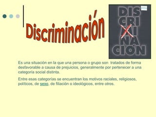 Este documento define la discriminación como el trato desfavorable a personas o grupos debido a prejuicios sobre su raza, religión, género u otras categorías. Explica los tipos de discriminación positiva y negativa, y describe varias formas específicas de discriminación como el racismo, sexismo y discriminación a discapacitados. También resume los esfuerzos de las Naciones Unidas y de México para combatir la discriminación a través de leyes y políticas de derechos humanos.