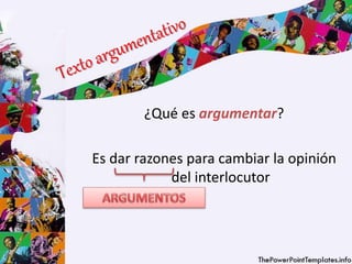 Argumentar es dar razones para cambiar la opinión del interlocutor mediante argumentos lógicos o afectivos. Los argumentos lógicos apelan a la razón mientras que los afectivos apelan a las emociones. Existen dos tipos de argumentación: secuencial, que presenta una tesis y luego argumentos a su favor de forma deductiva o inductiva, y dialógica, que presenta una tesis y un contraargumento y luego refuta este último para fortalecer la tesis inicial.