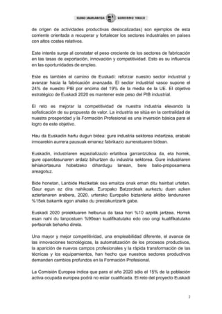 El documento describe la inauguración de un congreso internacional sobre formación profesional en el País Vasco. El Lehendakari destaca que la formación profesional es fundamental para mejorar la competitividad de las empresas y crear nuevas oportunidades de empleo. También señala que la Agenda Estratégica de Formación Profesional que aprobará el gobierno otoño modernizará el modelo para adaptarlo a las necesidades cambiantes.