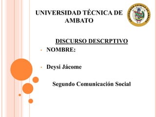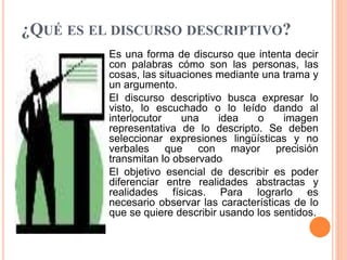 El documento describe el discurso descriptivo, que intenta representar personas, cosas y situaciones mediante palabras de manera que transmitan una imagen clara al lector. Explica que la descripción selecciona expresiones lingüísticas precisas para transmitir observaciones y diferenciar entre realidades abstractas y concretas. Además, señala que la descripción es útil en textos académicos y científicos para dar cuenta de manera organizada del mundo natural y social.