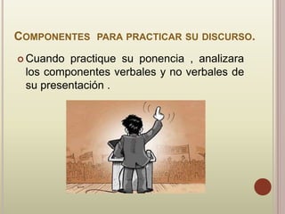 Este documento proporciona instrucciones para preparar y presentar un discurso efectivo. Explica los componentes verbales como la claridad, el énfasis y la acción corporal, así como los componentes no verbales como la voz, la articulación y el contacto visual. También describe cómo practicar el discurso, usar notas y apoyos visuales de manera efectiva, y realizar un ensayo completo para mejorar la presentación.