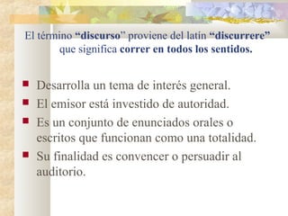 El discurso público se refiere a comunicaciones orales o escritas sobre temas de interés general dirigidas a audiencias amplias. Tiene la intención de convencer o persuadir e incluye una introducción, desarrollo del tema principal y conclusión. Los discursos públicos tratan asuntos relevantes para la comunidad y son emitidos por personas con autoridad en contextos formales.