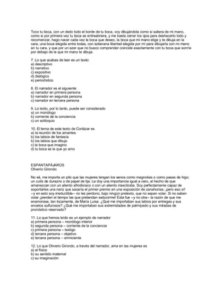 Este documento contiene un examen de discurso con 10 preguntas sobre diferentes textos literarios. El primer texto analizado es un párrafo de Lázaro de Tormes donde habla de dejar constancia de cosas señaladas para que no se olviden. El segundo texto es un poema corto de Julio Cortázar sobre tocar los labios del amante. El tercer texto es un pasaje de Oliverio Girondo donde describe lo que busca en una mujer.