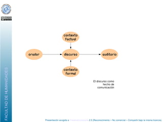 El documento define el discurso como un hecho de comunicación que no es simplemente un texto o una perorata, sino un enunciado lingüístico con intención persuasiva que puede explicarse desde la teoría de la comunicación. El documento fue elaborado para una asignatura de la Universidad de Almería y está disponible bajo una licencia Creative Commons.