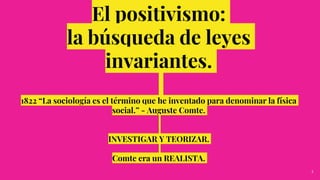 El documento resume las ideas principales de Auguste Comte sobre el positivismo. Comte propuso que la sociología podría estudiarse como una ciencia positiva, estableciendo leyes invariantes sobre la sociedad de manera similar a las ciencias naturales. También desarrolló la idea de que la humanidad pasa por tres etapas intelectuales: teológica, metafísica y positiva. Aunque algunas de sus ideas posteriores fueron absurdas, Comte sentó las bases para que la sociología emergiera como una disciplina científica y propus